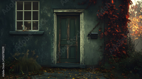 © Mix Creative, Fototapeta premium A deserted house from the 1940s. It’s dark green with a terracotta, in Glenmont. the front door is wide-open, swaying ominously in the autumn wind
