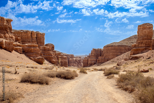 Fototapeta premium A deserted road along an ancient canyon. Landscape background, Kazakhstan