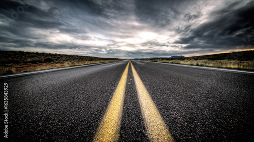 Naklejka premium A deserted road stretches toward the horizon under dramatic cloudy skies,...