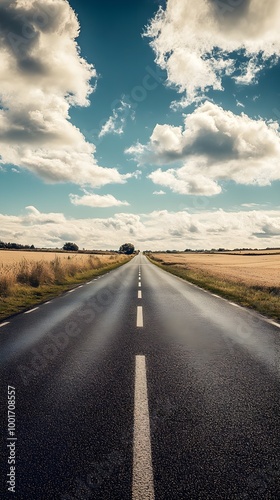 © PondLord, Fototapeta premium A deserted rural road stretching into the horizon, flanked by fields and a gentle breeze effect