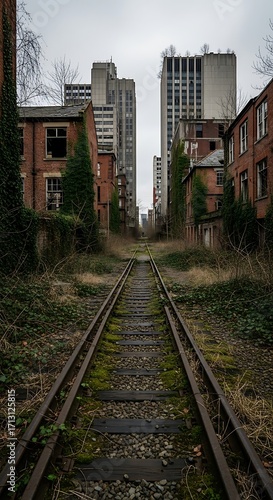Naklejka premium A deserted train track winds through a forgotten urban alleyway, lined with overgrown, decaying buildings.