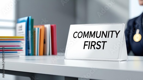 © ธนากร บัวพรหม, Naklejka premium A desk with a "Community First" sign and organized folders, representing a commitment to community engagement and support.
