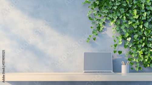 Fototapeta premium A desk with a trailing ivy plant cascading down from a shelf, adding a touch...