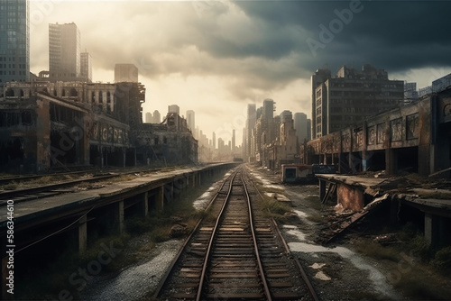 © Elka, Fototapeta premium A Desolate, Abandoned Cityscape With Ruined Skyscrapers And Crumbling Infrastructure. Generative AI