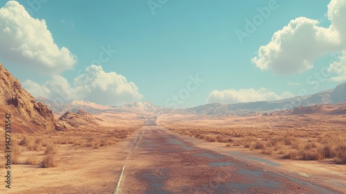 Naklejka premium A desolate desert highway leading into the distance with mountains and blue sky