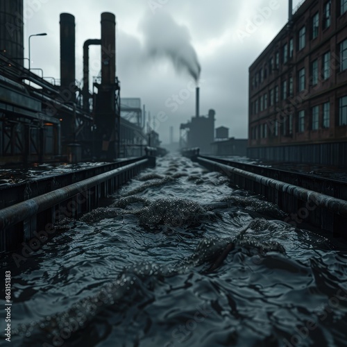Fototapeta premium A desolate industrial site with polluted water stream and smokestacks...