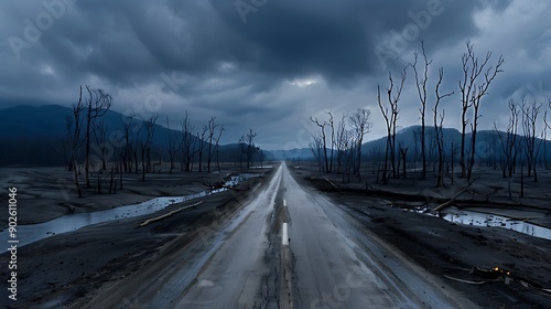 © naphat, Fototapeta premium A desolate, war-torn landscape with charred trees, destroyed buildings, and polluted rivers