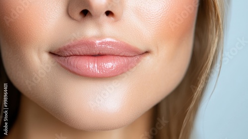 © Pinklife, Fototapeta premium A detailed and artistic close-up of a person's lips and lower face showcasing a soft blue background and partially visible hair, highlighting beauty and texture.
