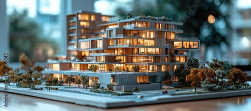 © M_H_L, Obraz premium A detailed architectural model of a modern building, illuminated and surrounded by trees.