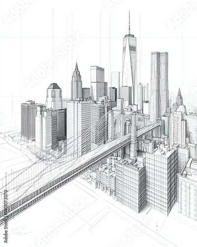 Naklejka premium A detailed architectural sketch of a modern skyline, showcasing iconic skyscrapers and intricate bridges in urban design.