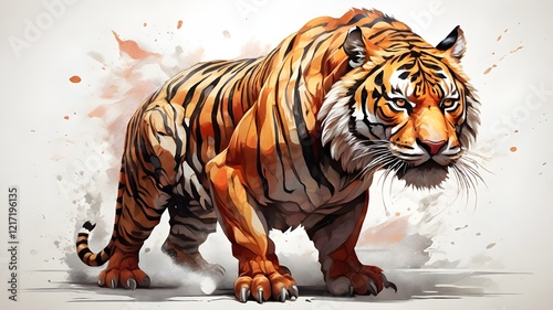 © Aleeza, Naklejka premium A detailed artistic illustration of a tiger with a bold and fierce expression, placed against a bright white backdrop that enhances its dramatic stripes and commanding presence.