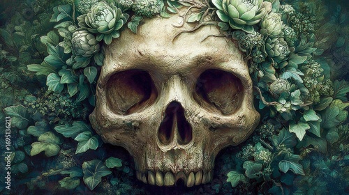 © FrameShift, Naklejka premium A detailed artistic image featuring a skull encircled by vibrant, flourishing green leaves and blooms.