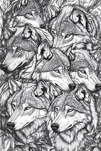 Fototapeta premium A detailed black and white drawing showcases a pack of wolves, each wolf's...