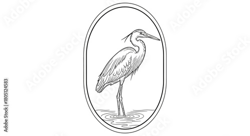 © Wisnu505, Naklejka premium A detailed black and white illustration of a heron standing in shallow water within an oval frame.