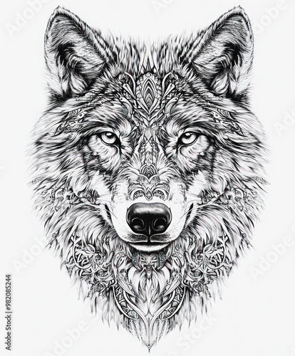 Fototapeta premium A detailed black-and-white illustration of a wolf's head with intricate...