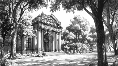 Naklejka premium A detailed black and white sketch beautifully captures a historic sanctuary, featuring elegant architectural elements and a lively scene, rich in cultural significance. Ironscape. Illustration
