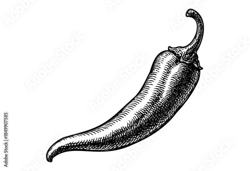 Naklejka premium A detailed black and white sketch of a single chili pepper with a textured...