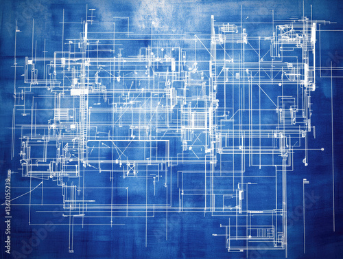 © sergign, Obraz premium A detailed blueprint-style design representing complex technological systems and connections through intricate lines and shapes.