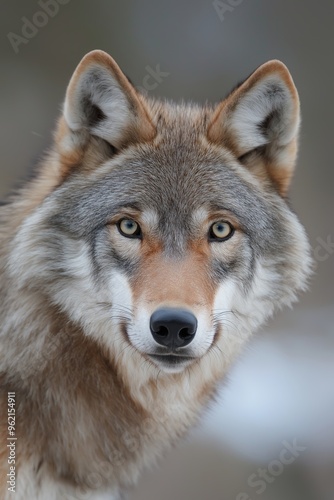 Fototapeta premium A detailed close-up of a gray wolf with piercing eyes, capturing the essence...