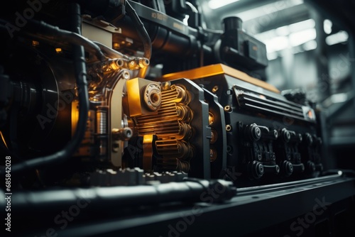 Fototapeta premium A detailed close-up of a machine in a factory. This image captures the intricate details of the machine's parts and mechanisms. Ideal for illustrating industrial processes and manufacturing.