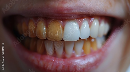 © andriyyavor, Fototapeta premium A detailed close-up of a person's smile showing the state of teeth whitening, with a mix of white and yellow teeth, highlighting the importance of dental hygiene.