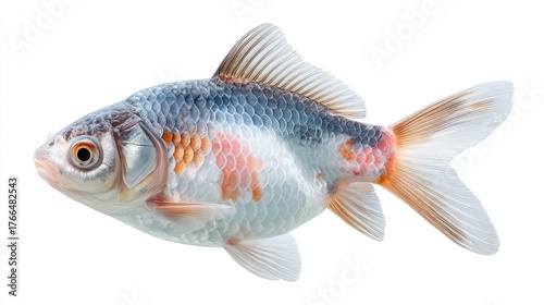 © Zaz, Fototapeta premium A Detailed Close-Up Of A Swimming White And Orange Goldfish With Black Accents Isolated On A White Background With Fin Details Visible In Soft Studio Lighting