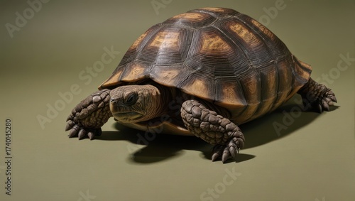 © Yunia, Obraz premium A detailed close-up of a terrestrial tortoise with a textured shell and scaly legs on a plain background.