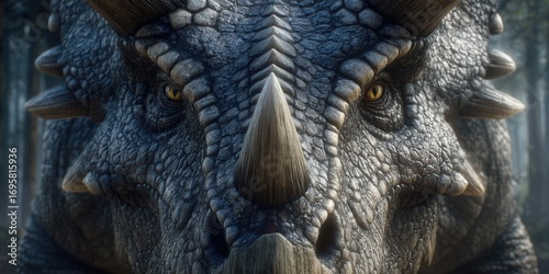 © Artem, Obraz premium A detailed close-up of a triceratops, displaying its impressive horns and intense gaze.