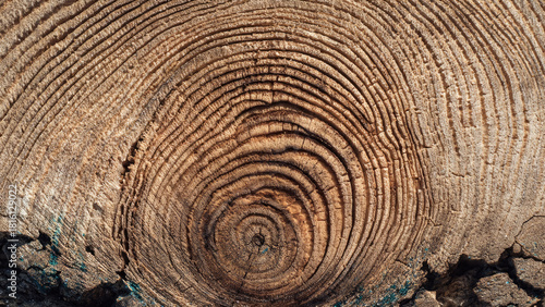 Fototapeta premium A detailed close-up of a weathered wooden log's cross-section, showcasing...
