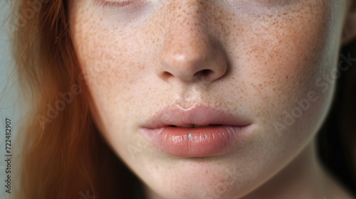 Obraz premium A detailed close up of a woman's face showcasing her unique freckles. This...