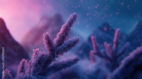Fototapeta premium A detailed close-up of evergreen pine branches, coated in shimmering frost, under a moody cyan and magenta light scheme