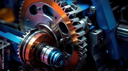 Fototapeta premium A detailed close-up of interlocking gears in dynamic metallic hues,...