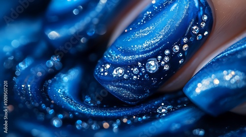 © ThuyTrang, Obraz premium A detailed close-up of nails with deep sapphire blue tones, featuring silver and white marble patterns and tiny rhinestone accents. The nails shine under bright light,