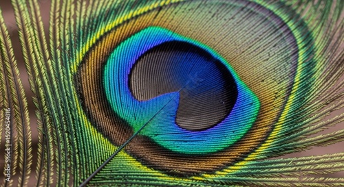 Naklejka premium A detailed close-up shot captures the iridescent beauty of a peacock feather,...