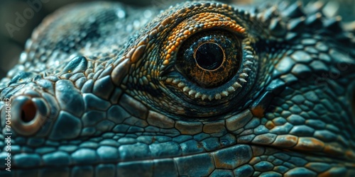 © Fotograf, Fototapeta premium A detailed close-up view of a lizard's eye. This image can be used to depict reptiles, wildlife, nature, or close-up photography