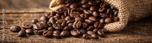 Fototapeta premium A detailed closeup of coffee beans spilling from a burlap sack, highlighting...