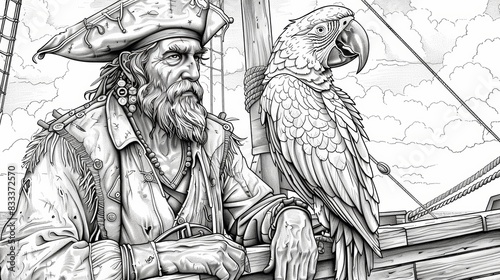 Fototapeta premium A detailed coloring page of a pirate captain with a wooden leg and a parrot on his shoulder, standing on the deck of his ship.