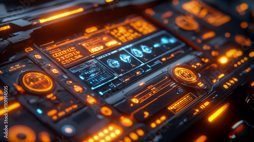 © sommersby, Obraz premium A detailed control panel glows with bright neon lights in a futuristic environment, highlighting advanced technology and intricate displays