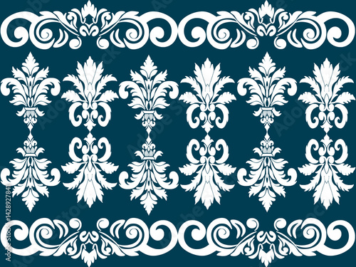 © TENSHI DESIGN, Naklejka premium A detailed damask pattern in white on a deep blue background, featuring floral motifs and intricate swirls, ideal for textiles or wallpapers.