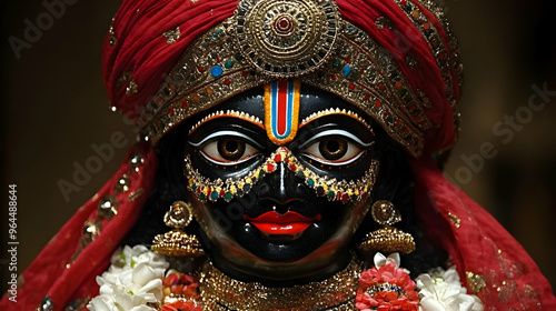 Naklejka premium A detailed depiction of a deity adorned with traditional jewelry and vibrant...