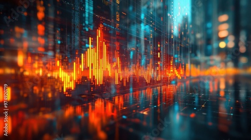 © Mohammed, Obraz premium A detailed depiction of fluctuating financial data visualizations with glowing orange and blue bar graphs in a digital futuristic environment.