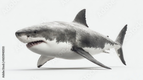 Fototapeta premium A detailed digital rendering of a great white shark, swimming against a stark white background, showcasing its powerful physique and sharp teeth
