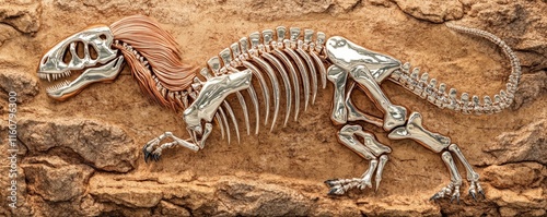 © Iswanto, Fototapeta premium A detailed dinosaur skeleton fossil displayed on a textured stone background.