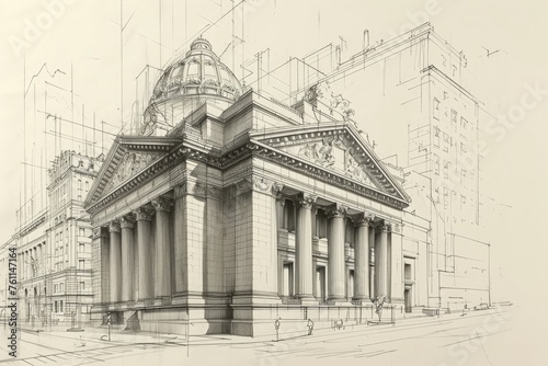 © Iftikhar alam, Fototapeta premium A detailed drawing of a building featuring elegant columns and a grand dome, A sketch of a traditional stock exchange building, AI Generated