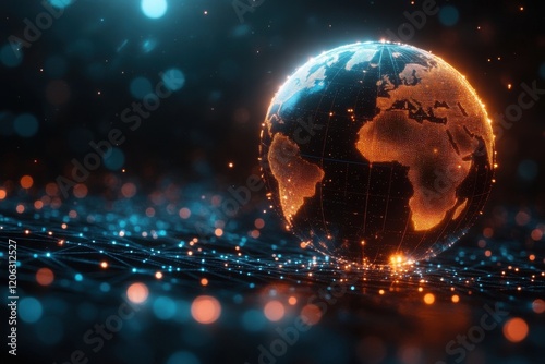 © Mariia, Obraz premium A detailed illuminated globe with highlighted continents against a dark digital background, showcasing global connectivity and data flow