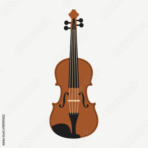 © Taimoor, Fototapeta premium A detailed illustration of a classical brown wooden violin with black strings and tuning pegs, set against a plain light background.
