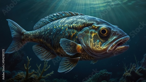 Fototapeta premium A detailed illustration of a fish swimming in the ocean with coral reefs and sunlight shining through the water.