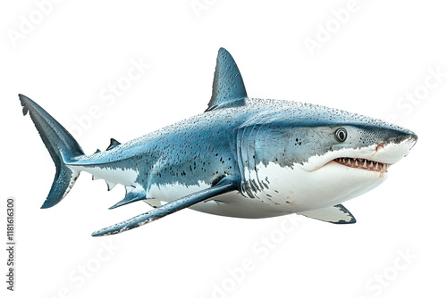 © venusvi, Naklejka premium A detailed illustration of a great white shark swimming, showcasing its powerful body and sharp teeth against a white isolated background.