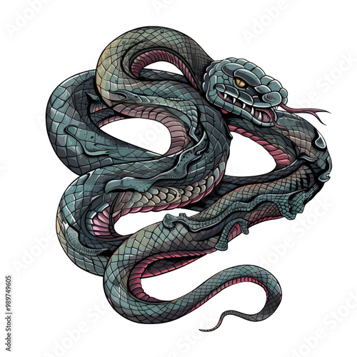 © sennauli, Obraz premium A detailed illustration of a green snake with a sharp, pointy head and yellow eyes coiled on itself, with a dark background and an ominous look.