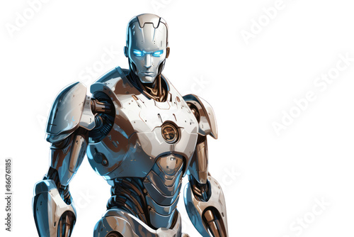 © Phuwadon, Fototapeta premium A detailed illustration of a humanoid robot, its metallic body gleaming under a spotlight, isolated on a white backdrop